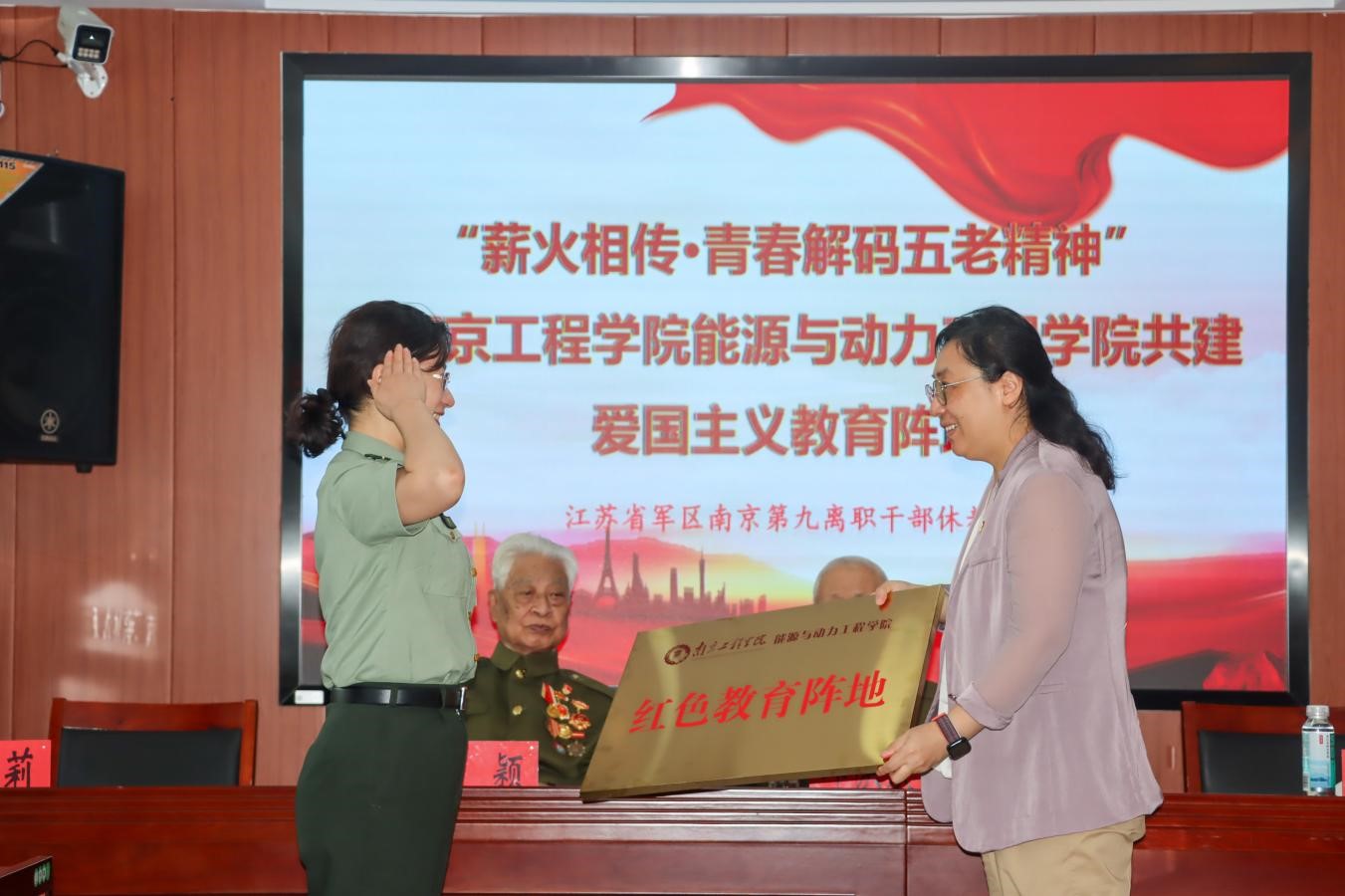 江苏省军区第九干休所政委回顾了干休所的光荣历史,强调“关爱革命五老、讲好红色故事”的时代意义。学院党委书记徐艳表示本次军地共建是高校用活本土红色资源、创新思想政治教育的积极探索,学院依托干休所宝贵资源,深入推动“红帆动力·能源先锋”党建品牌建设,把五老精神、建军精神有机融入“大思政”育人体系。双方为共建的“爱国主义教育阵地”揭牌,围绕红色课程共建、五老宣讲进校园、革命精神主题实践活动等方面展开深度合作,实现育人平台的军地共建。